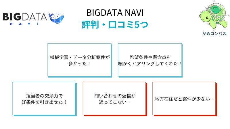 BIGDATA NAVIの概要やメリット・デメリット、評判・口コミをまとめると以下のとおりです。