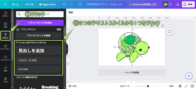 左側サイドパネルにあるテキストをクリックし、表示された「デフォルトのテキストスタイル」の中から1つ選んでクリックする