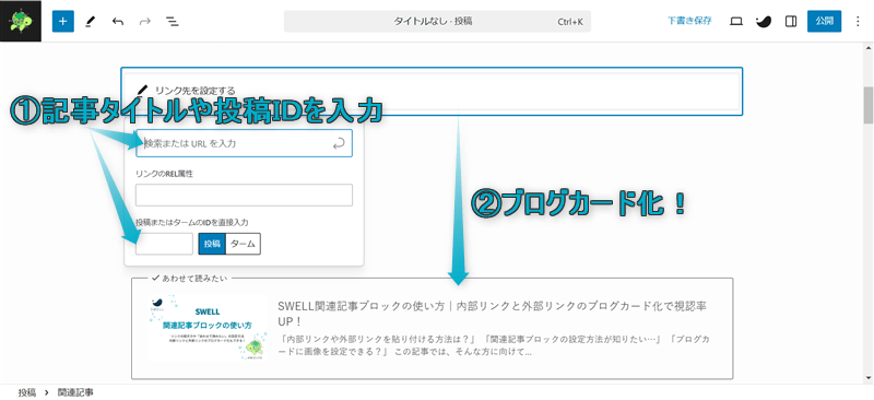 また関連記事ブロックでは、記事タイトルや投稿IDの入力だけでかんたんにブログカード化できます。