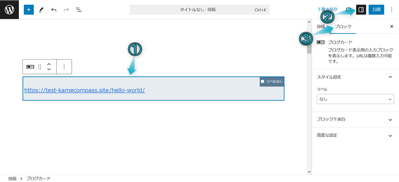 ページに挿入されたブログカードブロックに別記事のURLを入力する