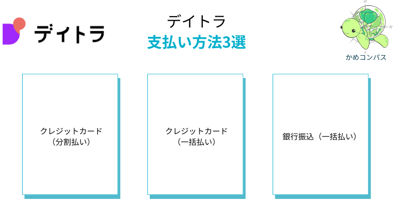 現在デイトラの支払い方法は「クレジットカード(分割・一括)」と「銀行振込(一括)」の3種類のみで、PayPay・コンビニ払い・その他QR決済(PayPay/LINE Payなど)やコンビニ前払いには対応していません。
