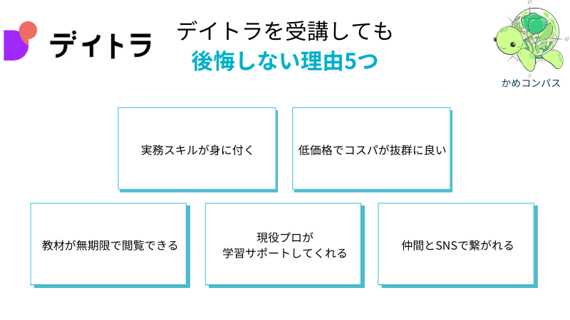 「デイトラで受講すると後悔する」というお声がありますが、以下5つの理由によりデイトラを受講しても後悔しません。
