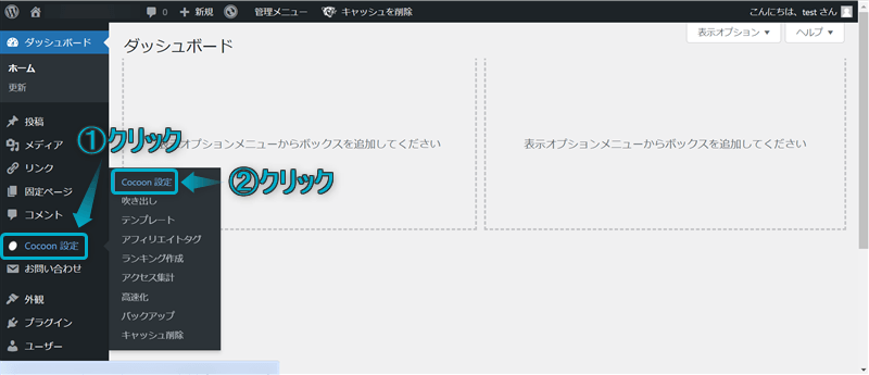 WordPress管理画面で、Cocoon設定⇒Cocoon設定の順にクリックする