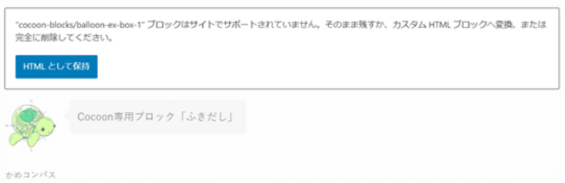 Cocoon専用のブロック「ふきだし」を例に、サポートされていない場合どういう風に表示されるかを示した画像です。