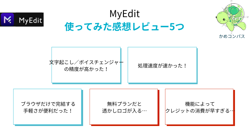 以上より、MyEditはAI機能が豊富でクオリティの高い編集ができる点が口コミでも高く評価されているツールです。