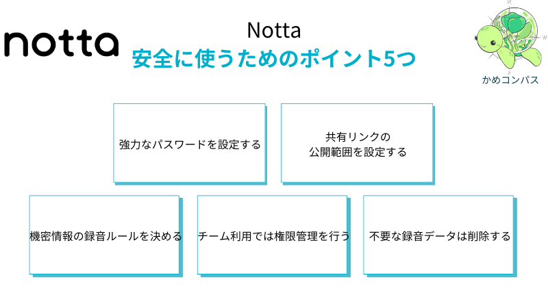 Nottaの情報漏洩を防いで安全に使うためのポイントは、以下の5つです。