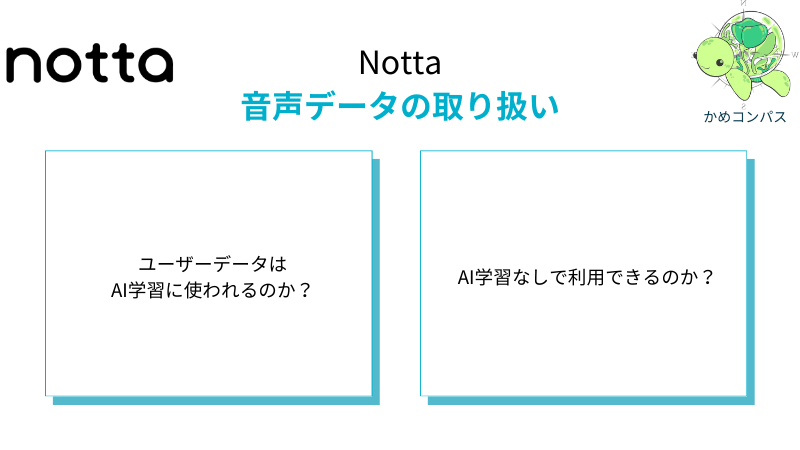 このように、Nottaはデータ利用の範囲が明確に制御されており、用途に応じて「AI学習あり・なし」を選べるため安心して利用できます。