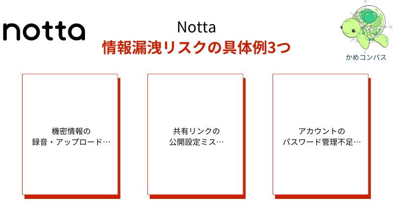 Nottaで情報漏洩リスクの危険性がある具体例は、以下の3つです。