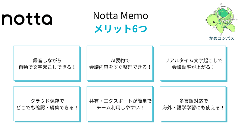 Notta Memoのメリットは、以下の6つです。