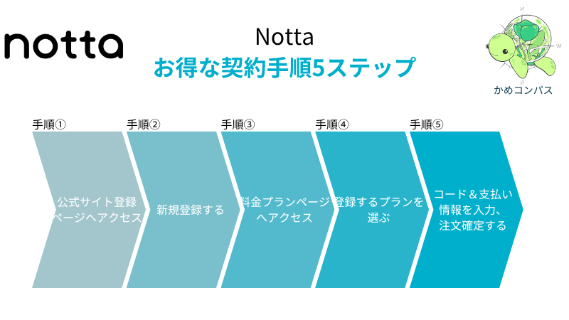 Nottaには割引クーポンがあり、以下5つの手順でお得に契約できます。