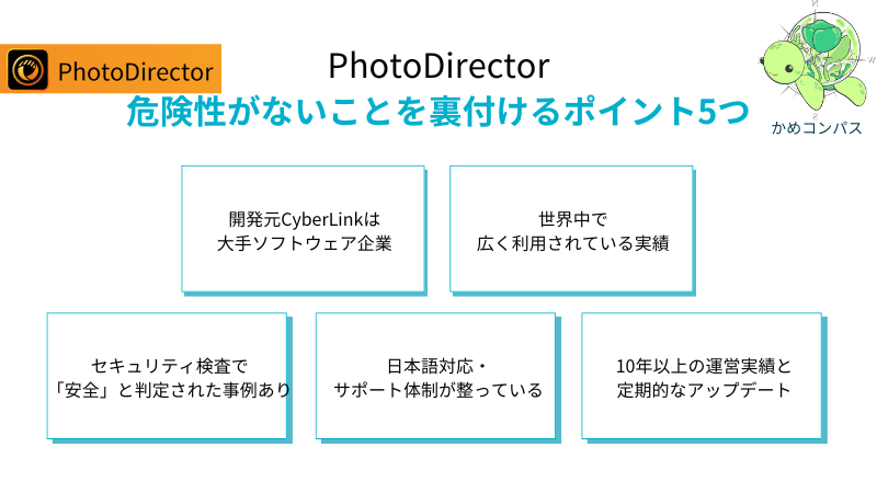 つぎに、PhotoDirectorに危険性がないことを裏付けるポイントは、以下の5つです。