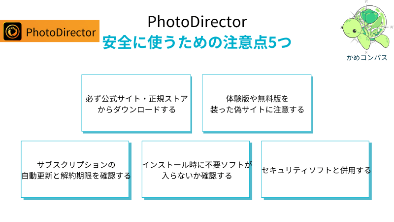 さて、PhotoDirectorを安全に使うために注意点を、以下の5つ紹介します。