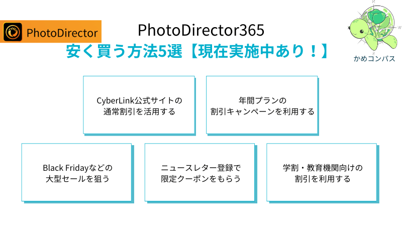PhotoDirector365をクーポンコードやセールで安く買う方法を、現在実施中のものも含めて以下5つに絞って解説します。