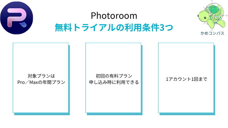Photoroomの無料トライアルの利用条件は、以下の3つです。