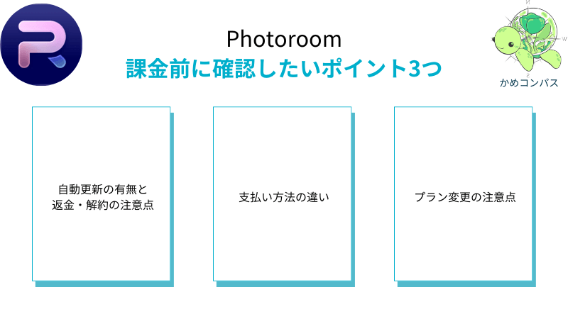 Photoroomで課金前に確認したいポイントは、以下の3つです。