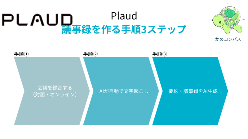 Plaudで議事録を作る流れは、以下の3ステップです。