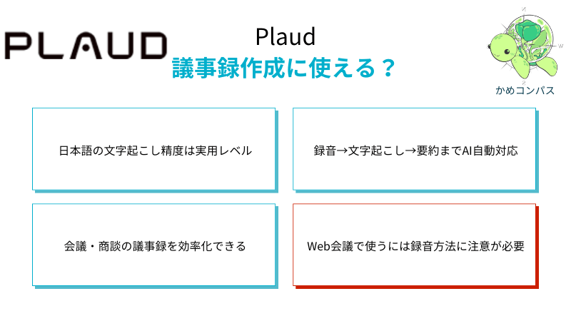 Plaudは議事録作成に使えるかどうか、以下4つの項目に分けて解説します。