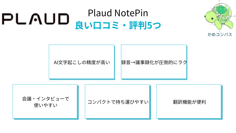 実際の利用者の声をもとに、Plaud NotePinの良い評判・口コミを5つに厳選して紹介します。