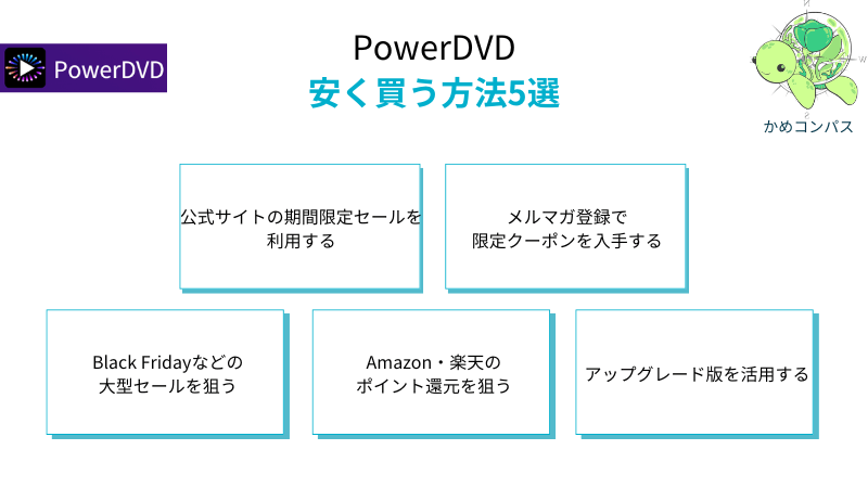 PowerDVDをクーポンコードやセールで安く買う方法を、現在実施中のものも含めて以下5つに絞って解説します。
