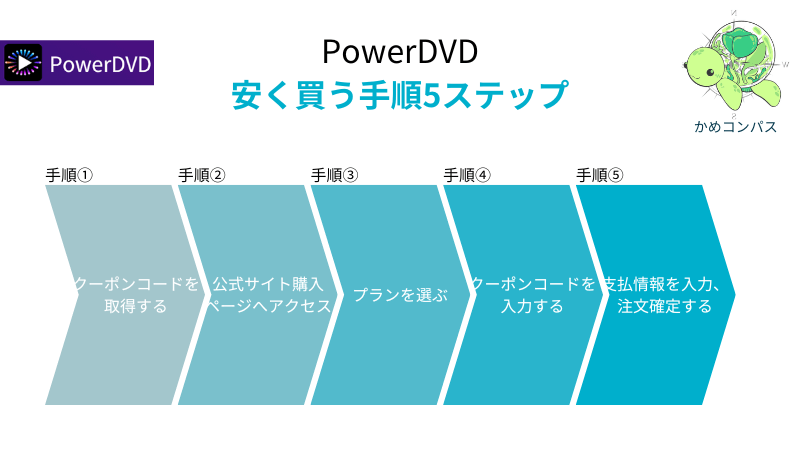 PowerDVDでクーポンコードを使う方法とセールで安く買う手順は、以下の5ステップです。