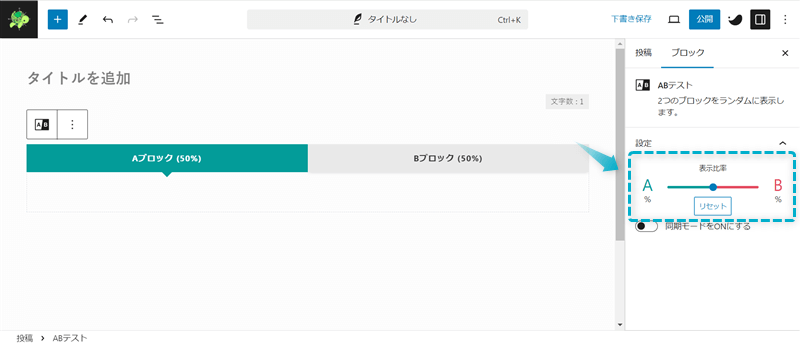 SWELLのABテストブロックでは、AブロックとBブロックそれぞれの表示比率を設定できます。