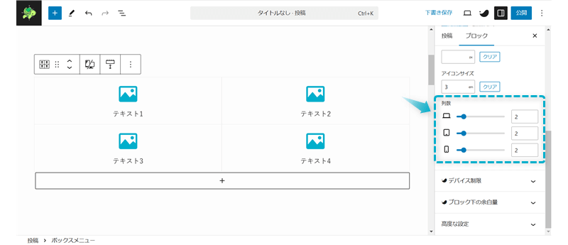 ボックスメニューをどこに配置するかによって設定する列数は変わってきますが、基本は2や4などの偶数がおすすめです。