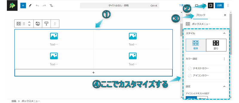 では、ボックスメニューブロックで設定できることをそれぞれ詳しく解説します。