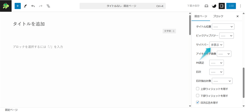 上記それぞれの設定方法は、ページ編集画面の右上にある設定⇒固定ページタブ内で行います。