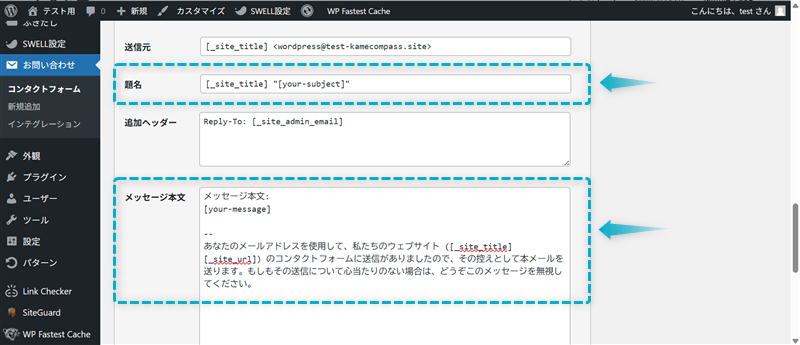 [_site_title]…自サイト名、[_site_url]…自サイトURL、[your-subject]…題名、[your-message]…メッセージ本文、[your-name]…ユーザーの氏名、[your-email]…ユーザーのメールアドレス