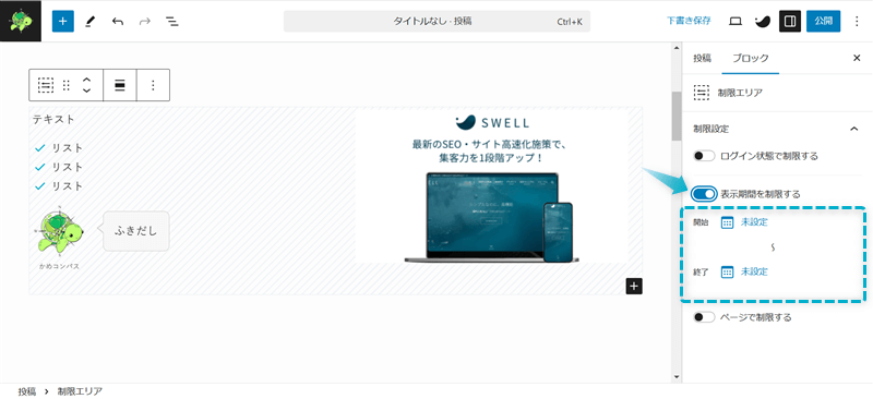 ここから、SWELLの制限エリアブロックで表示期間を制限していきます。