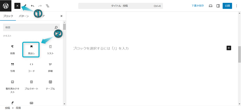 /見出し、もしくは/headingを入力する ※「/(スラッシュ)」は半角で入力してください。